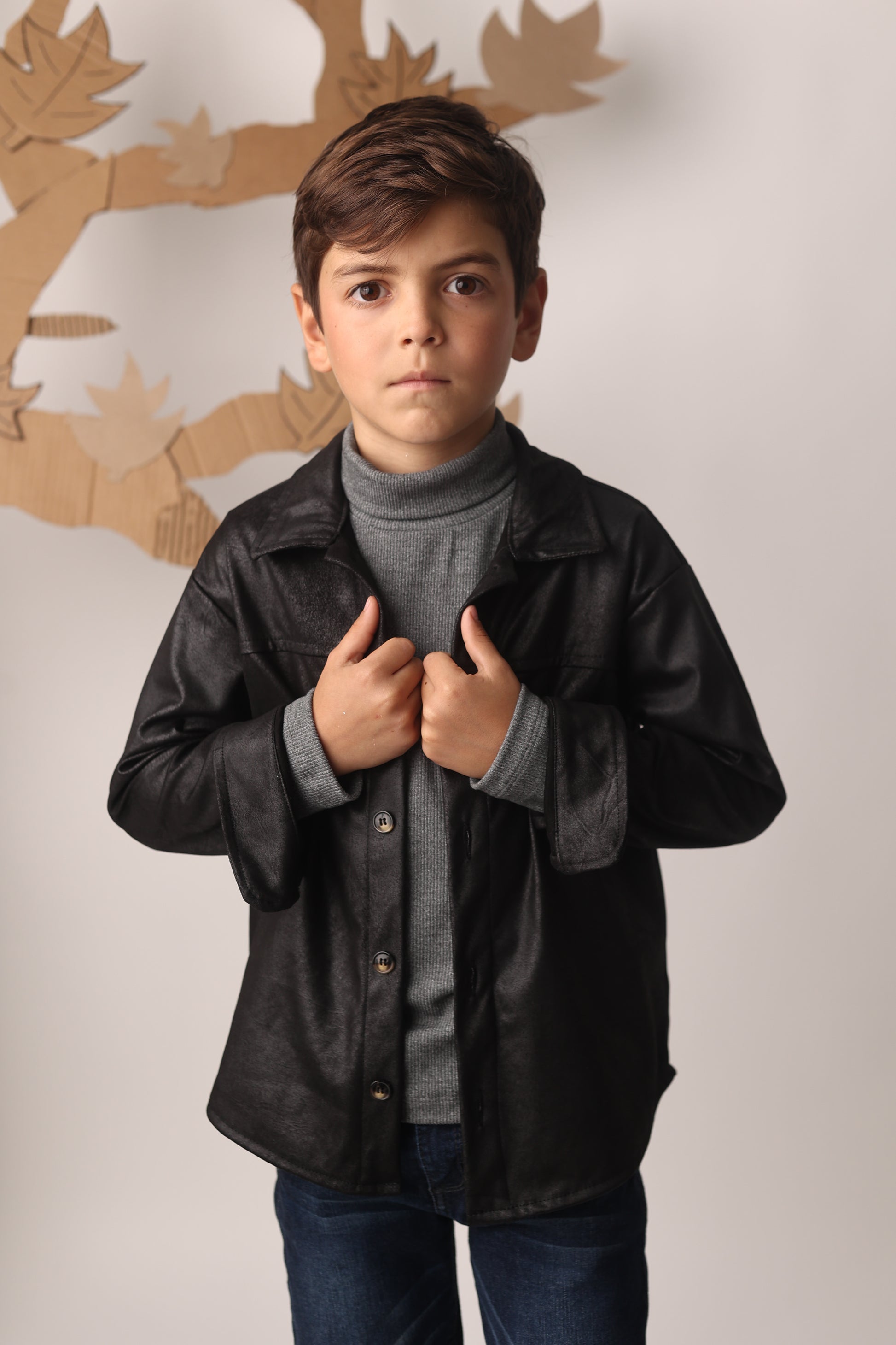 Camisa de botones con textura tipo piel en color negro, ideal para un look moderno y urbano. Puede usarse como chaqueta ligera sobre camisetas o suéteres delgados. El material tiene apariencia de cuero, pero es cómodo y flexible para niños.