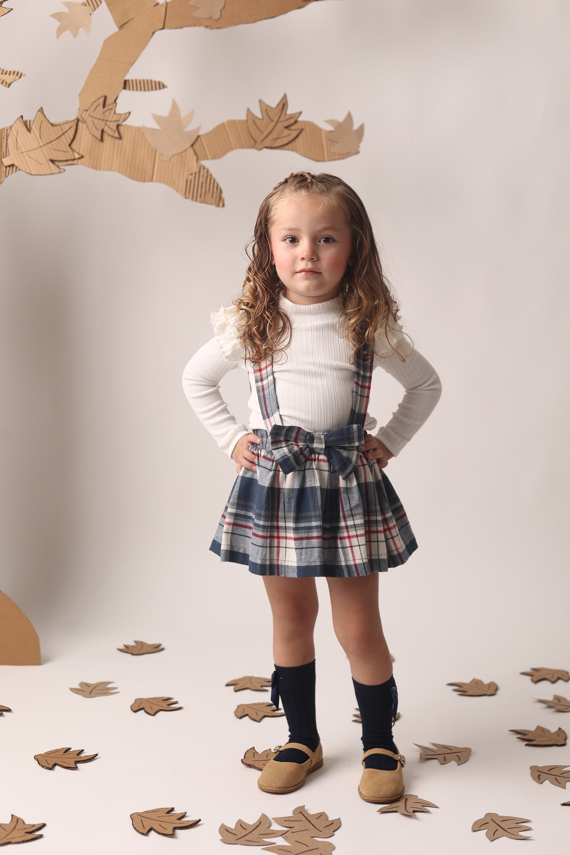 Conjunto de falda tipo jumper con tirantes y moño, en patrón escocés azul y rojo. Incluye blusa manga larga con olanes en los hombros. Ideal para eventos especiales o fotos familiares.