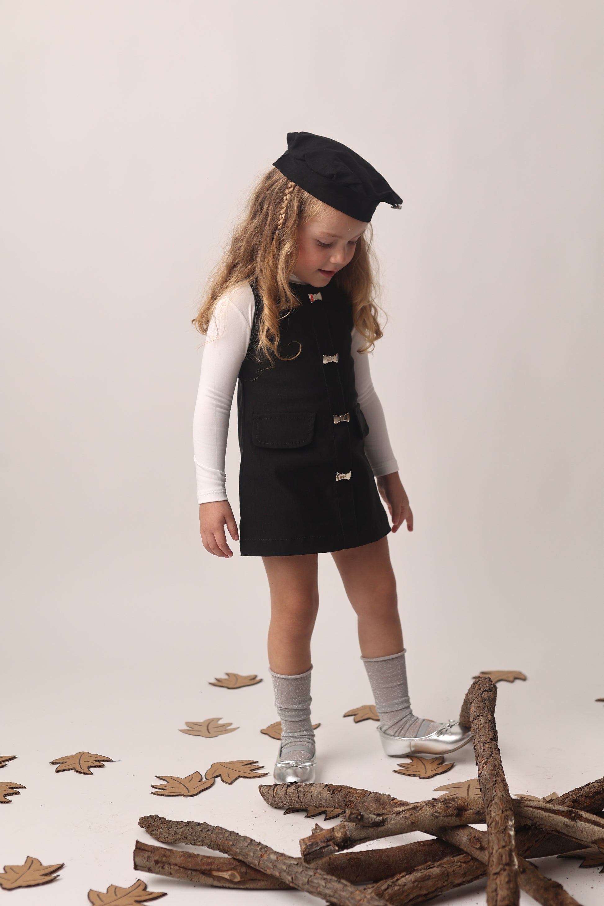 Vestido de mezclilla negro con moños en botonadura, manga larga blanca y boina incluida. Look francés para las más pequeñas.
